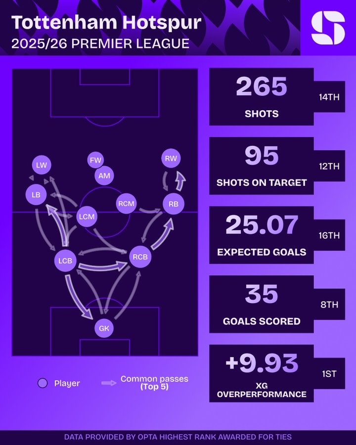 据Squawka统计,热刺本赛季英超预期进球仅为25.07粒,但打进35球,超出预期进球9.93粒,热刺是本赛季英超实际进球超出预期进球最多的球队。